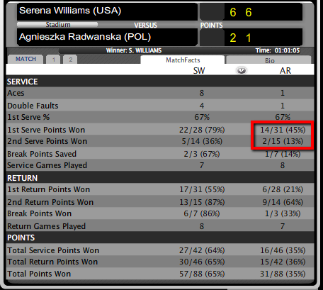 Not to say that a rested and refreshed Radwanska would’ve beaten Serena: it’s a terrible match-up for the Polish ninja, since Serena moves so well around the court and hits with so much pace off both wings. Also, Serena doesn’t take lightly to very slow second serves, or in this case, slow first serves - Radwanska was serving 67% 1st serves in the first set, mostly because she was taking off some pace to protect avoid having to hit a 2nd serve. Very often Serena hit a safe, deep shot and Radwanska could only muster a very short reply or a lob. Serena did miss one overhead, but she put plenty of them away.