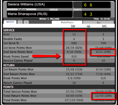 The other key battleground where Sharapova gets routed is on Serena’s serve. Like Federer against Roddick, you get the sense that Serena has way too many sweet spots when Sharapova is returning her serve. Particularly when going for the corners. Great servers have accuracy as well as pace, and that’s what makes Serena’s serve so dominant, and the fact that she has the same toss for every serve (like Sampras) makes her delivery extremely hard to anticipate. Sharapova’s lack of agility also hurts her when she has to reach for those corner serves. But let’s let the numbers do the talking: